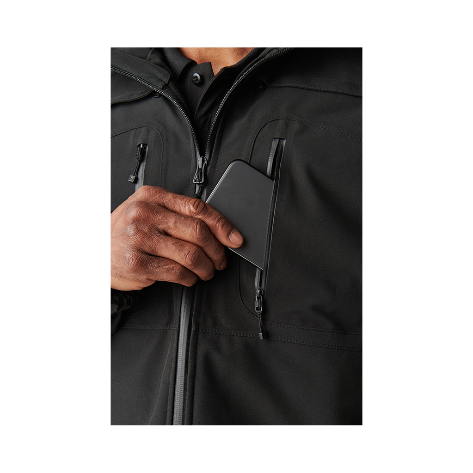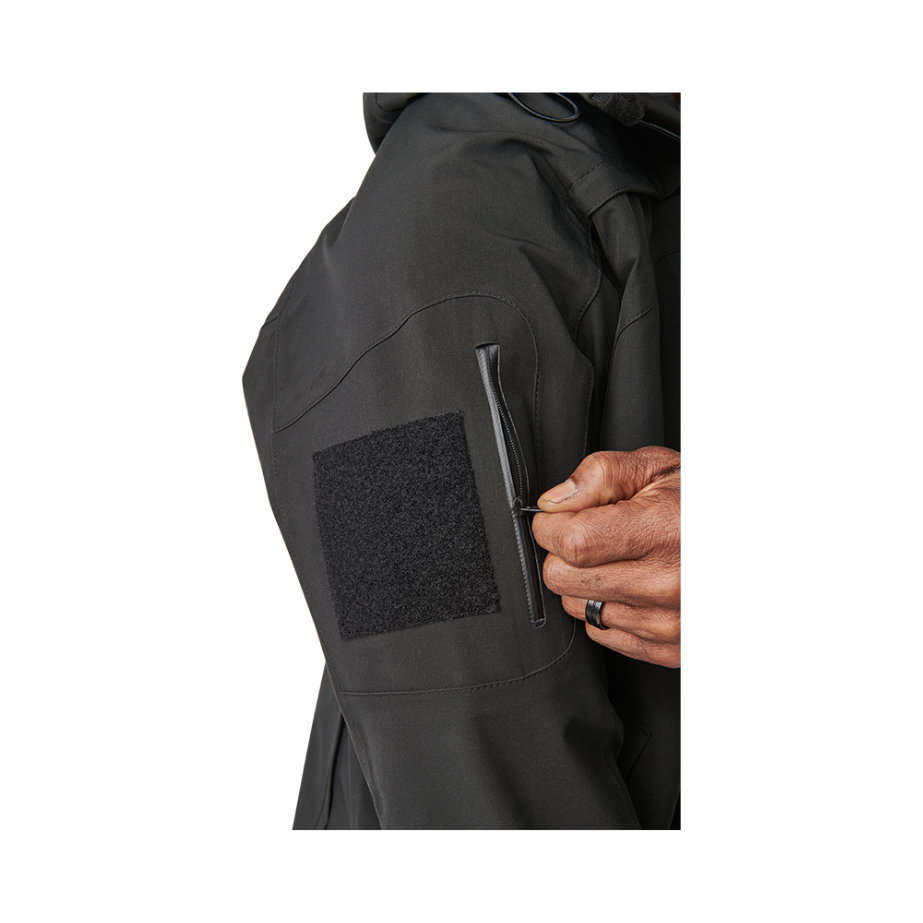 Fabricada con tela impermeable y transpirable 10K/7K, ofrece protección contra líquidos y agentes biológicos (BBP). Cuenta con capucha desmontable, sistema Quixip® para acceso rápido al equipo, y paneles ocultos desplegables en pecho y espalda para personalización o identificación. Sus ocho bolsillos, mangas articuladas y detalles ajustables la hacen tan versátil como resistente.