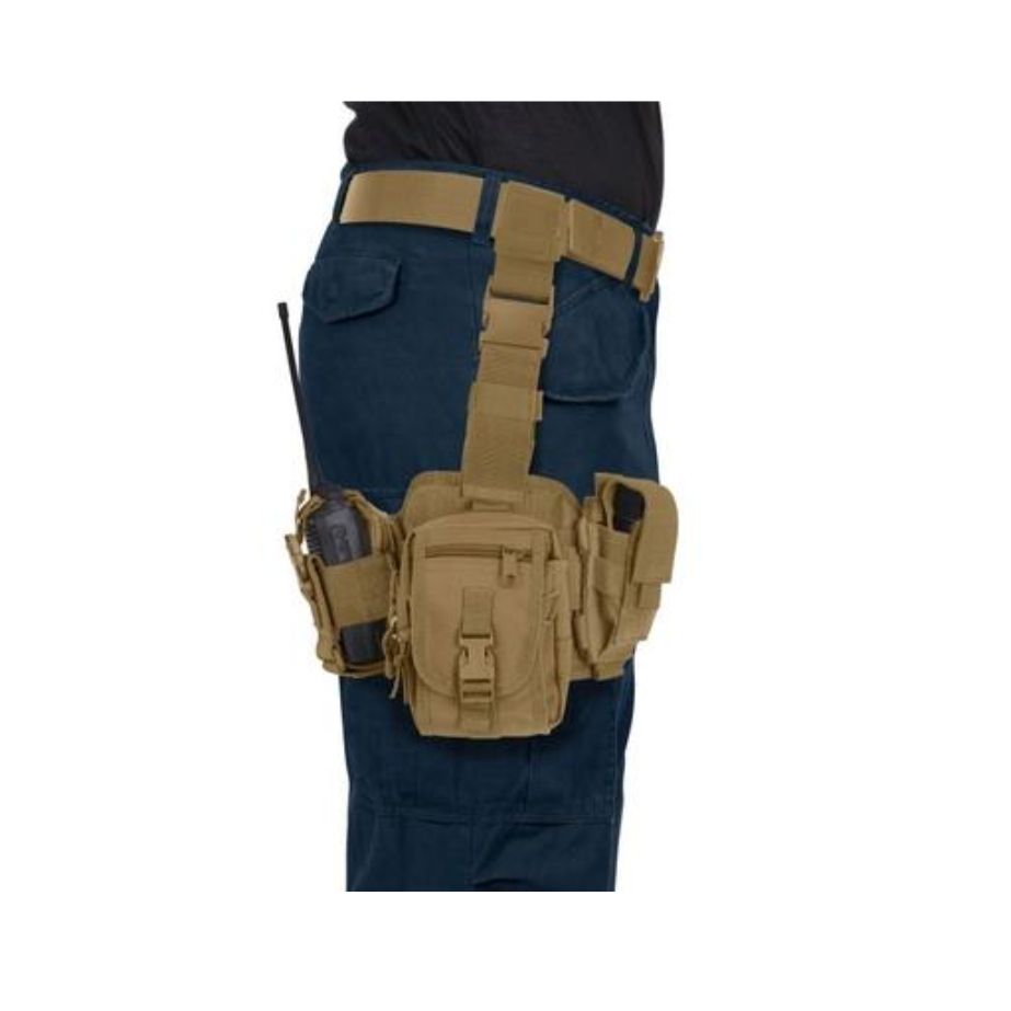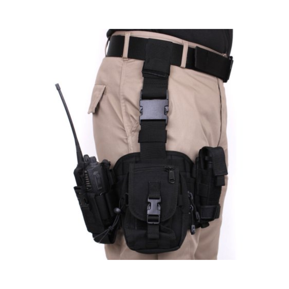 Plataforma táctica de muslo con sistema MOLLE y bolsillos modulares para operaciones en campo.